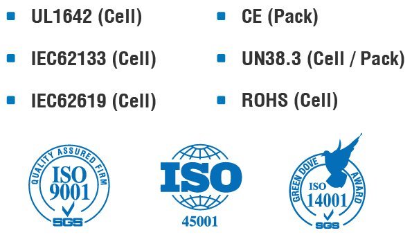 | UL1642(Cell) | IEC62619 (Cell) | UN38.3(Cell/ Pack) |